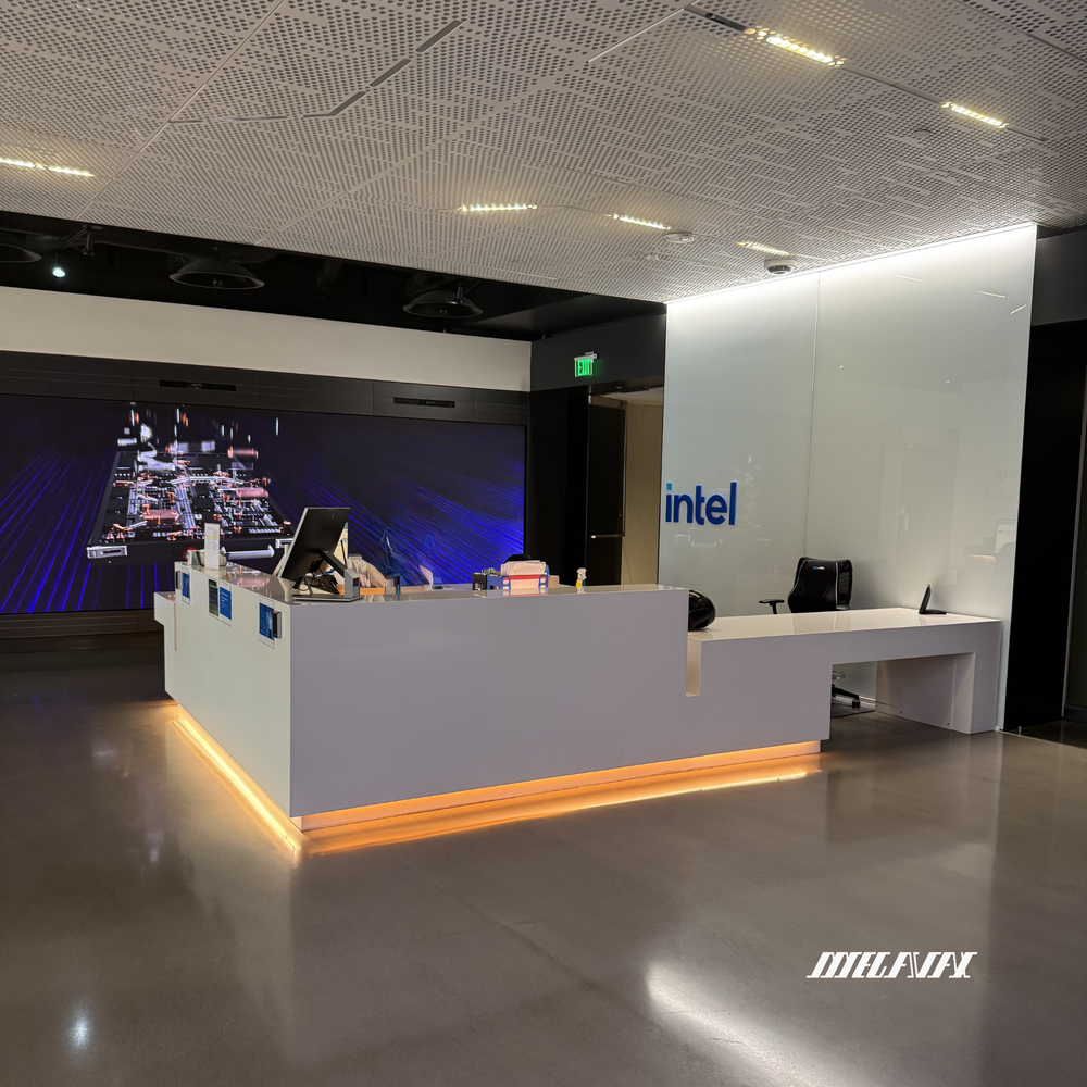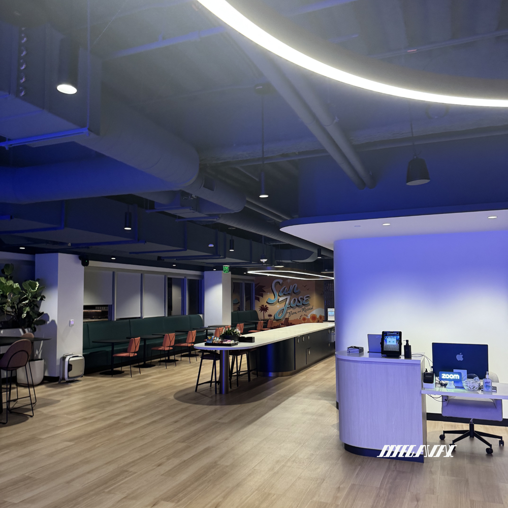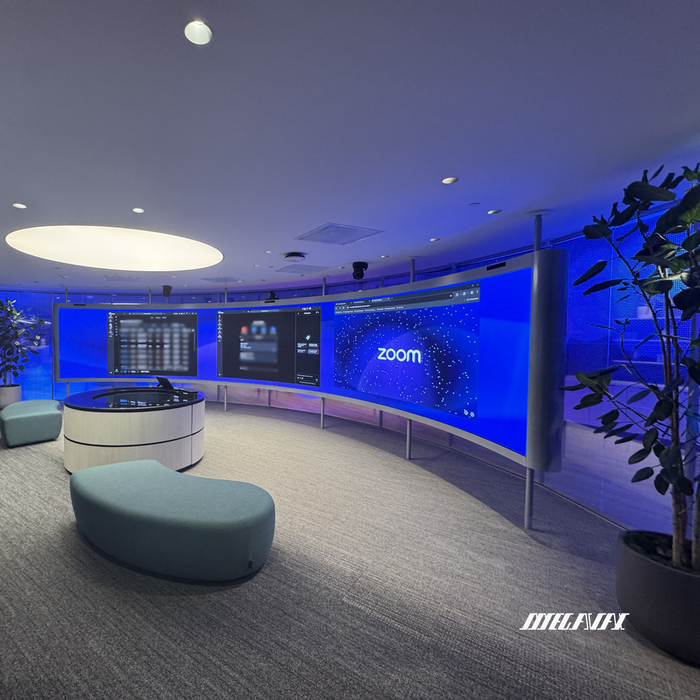 案内された空間は会議室ではなく、実機体験とデモができ、社員同士が自然に集まる構成になっていました。大型スクリーンやサインを含め、来訪者が理解しやすい順番で情報が入ってくるように設計されています。