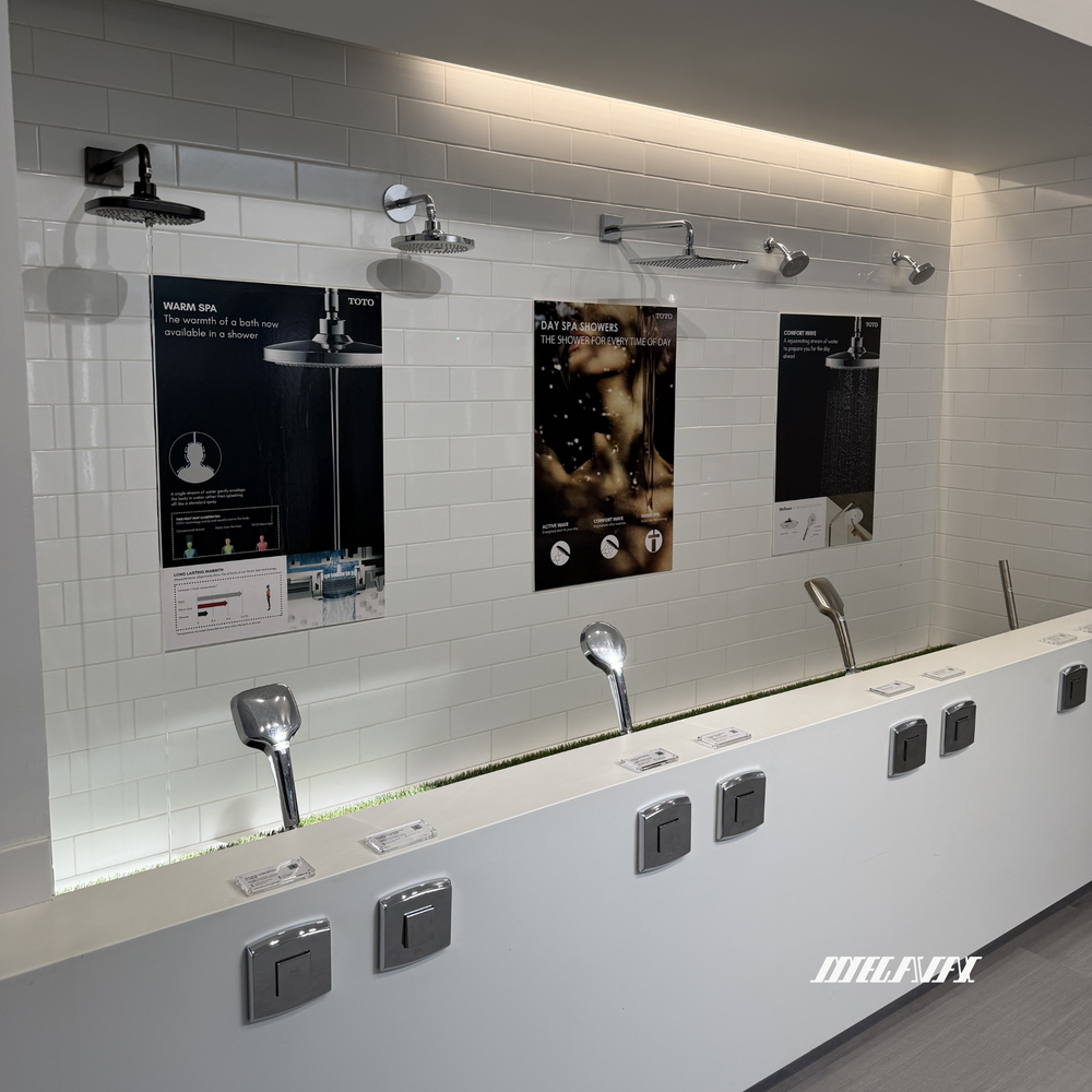 ショールーム内では、シャワーヘッドを体験できる構成があり、アメリカ向けのカタログやPR素材も洗練されていました。背景が違う人にも届くように作られている点が、日本とは違うアプローチとして参考になりました。