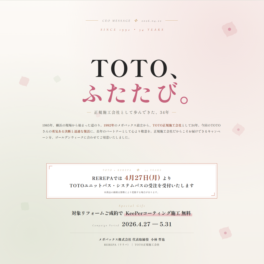 TOTO商品を取り扱い、現場調査や施工を正規施工会社として代行してきたリリパの運営会社、メガバックス株式会社 代表の小林です。今回の中東問題による受注停止を受け、弊社のこれまでの歩みとともに、皆さまへ思いをお伝えしたいと思います。